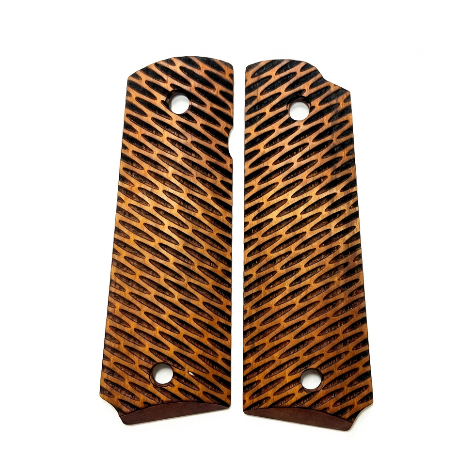 Step away from tradition with the Oval Slash texture. This modern, geometric pattern features deep, interlocking oval cuts that channel away moisture and debris while providing an intense grip surface. Machined from dense Turkish Walnut, the unique burnt finish highlights the texture depth, giving your 1911 a contemporary, custom look.