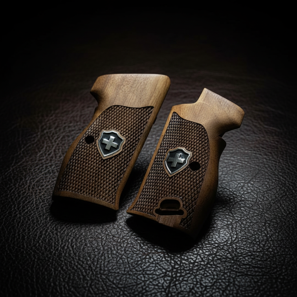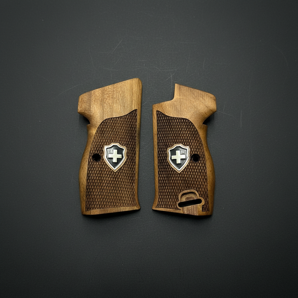 This grip combines the traditional feel of Full Checkering with a bold visual statement. The sharp diamond texture ensures maximum control and stability, while the Black Enamel Swiss Cross inlay provides a distinct, commanding look against the natural grain of the Turkish Walnut. Perfect for duty or range use.