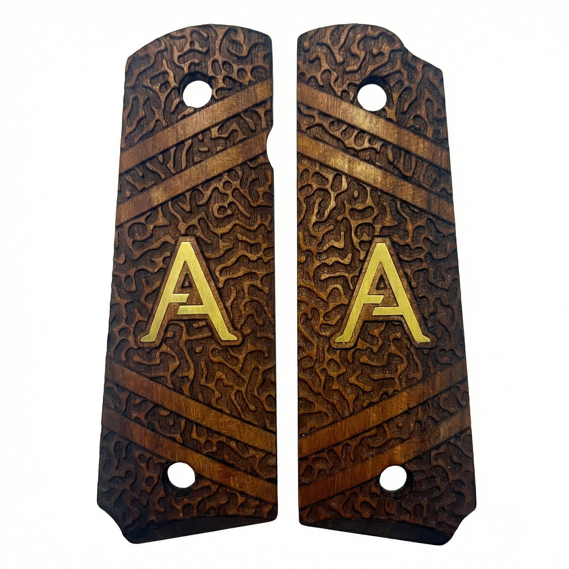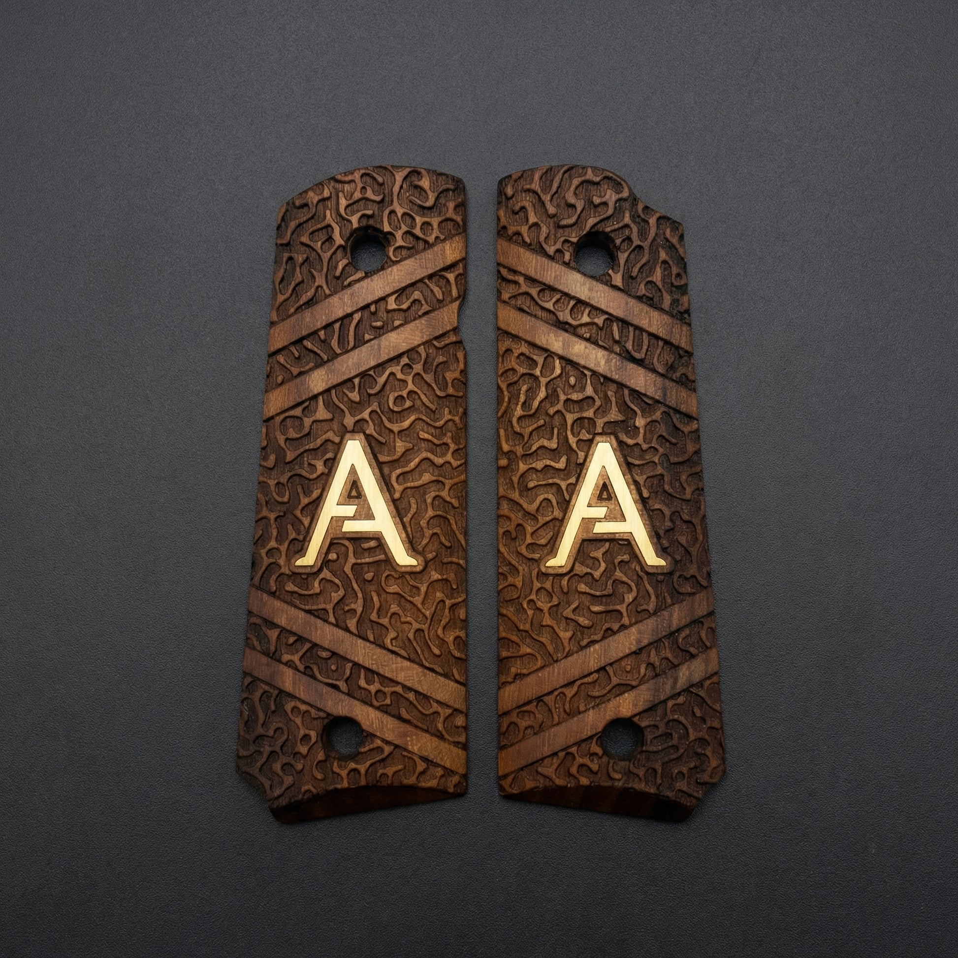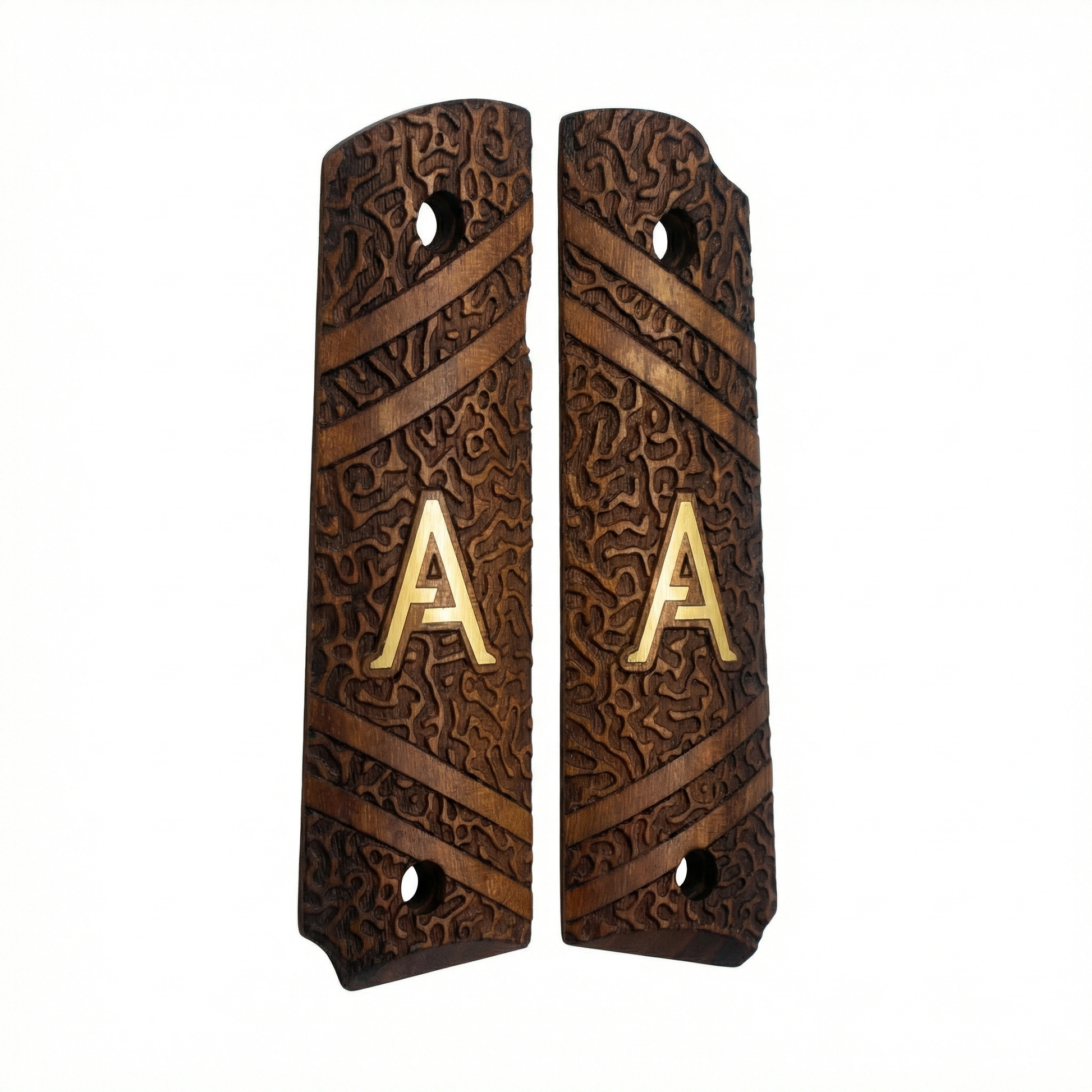 We strictly use high-grade, dense hardwoods such as Turkish Walnut, Rosewood, and exotic burls. Each grip is unique; the natural grain patterns ensure that no two pieces are exactly alike, giving your firearm a truly one-of-a-kind identity.
