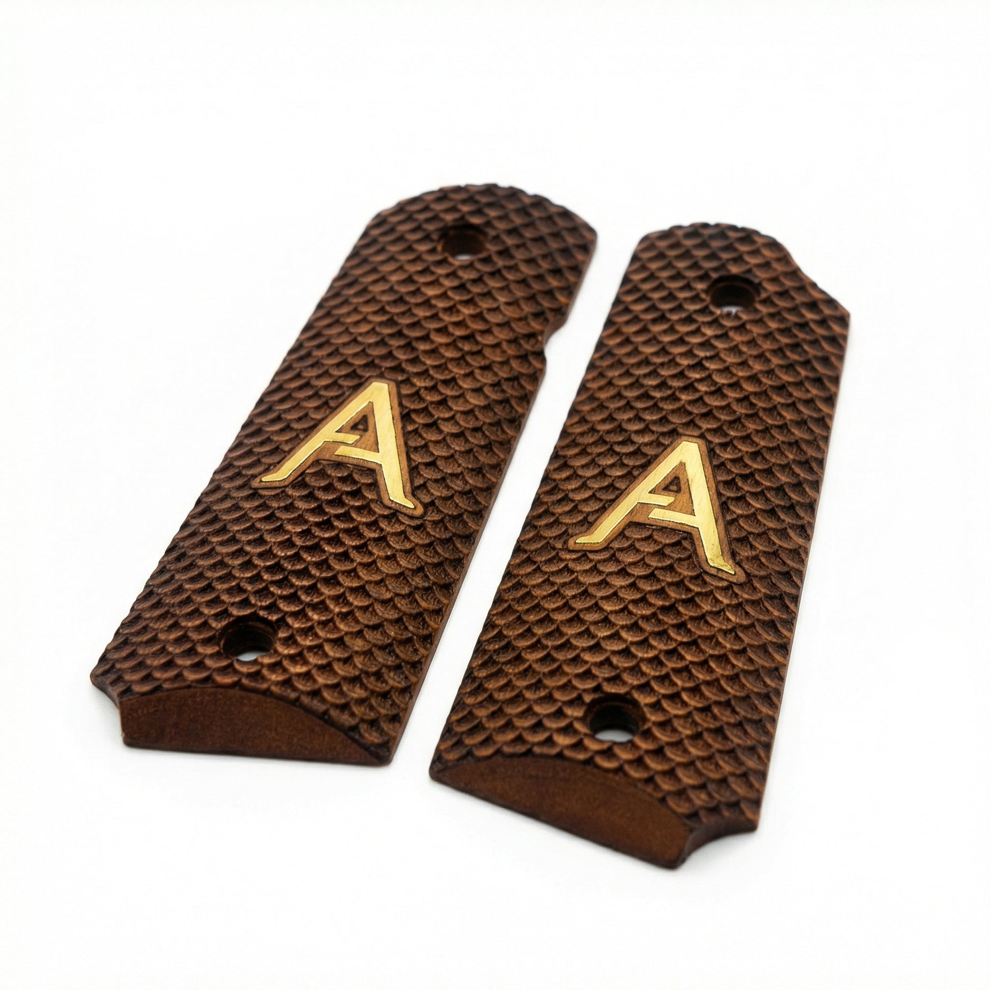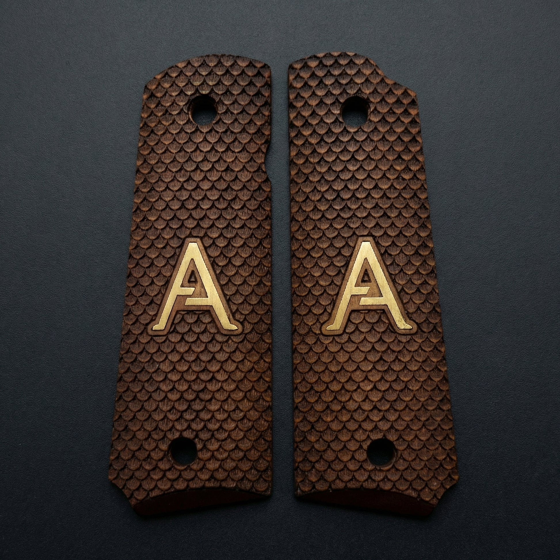 Upgrade to the Dragon Scale texture. These unidirectional scales provide a rock-solid grip that won't slip under recoil. Crafted from premium Turkish Walnut and finished with a custom Gold-Colored Initial inlay.