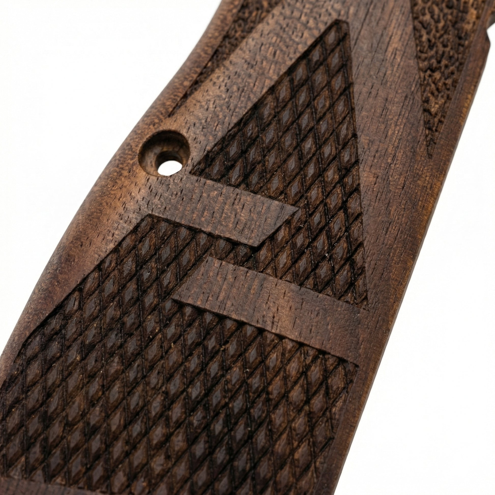 We strictly use high-grade, dense hardwoods such as Turkish Walnut, Rosewood, and exotic burls. Each grip is unique; the natural grain patterns ensure that no two pieces are exactly alike, giving your firearm a truly one-of-a-kind identity.