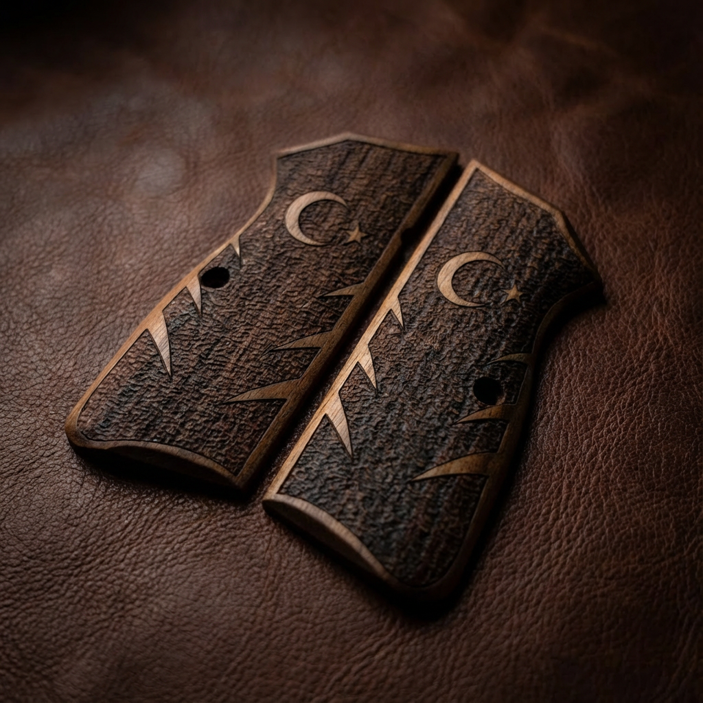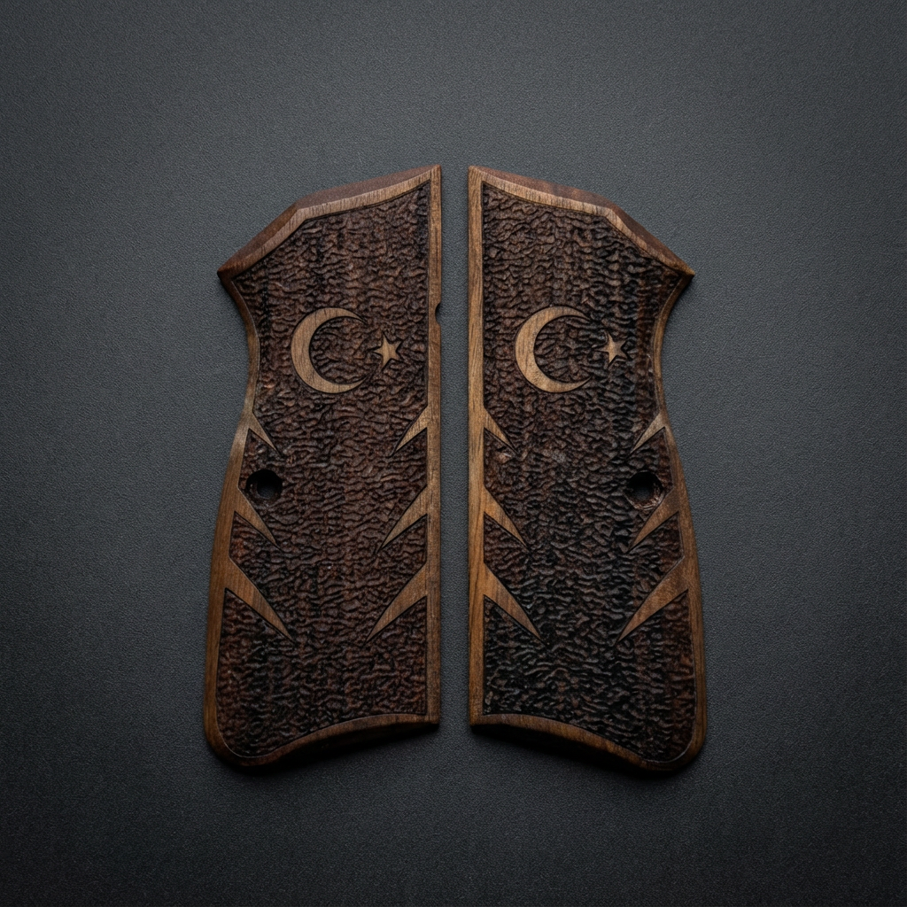 Carry your heritage with pride. These grips feature a rugged, stippled texture for excellent grip retention, centered with a precision-engraved Crescent and Star. The design is deeply carved into the Turkish Walnut, creating a lasting tribute that combines national symbolism with practical shooting performance.
