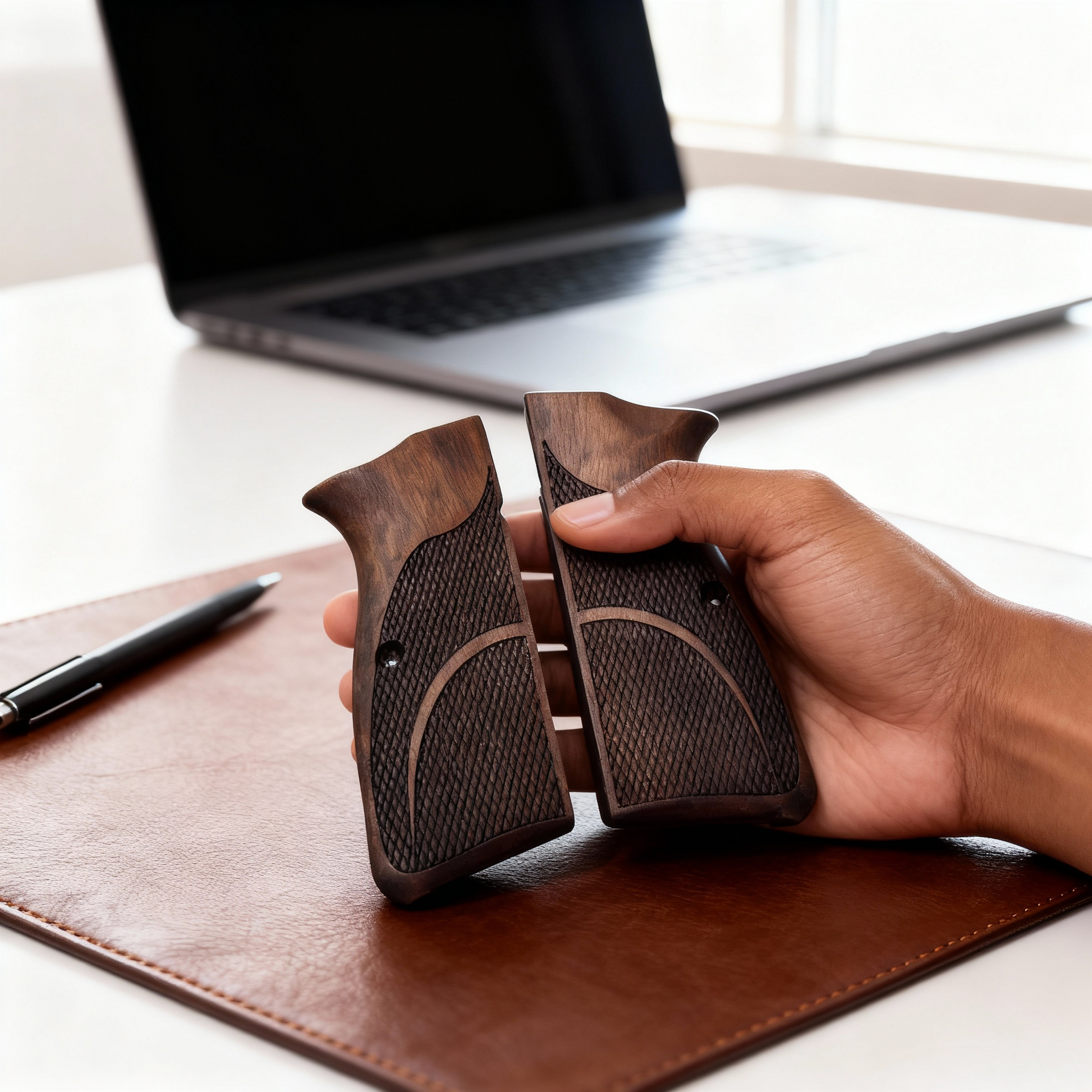 Select your platform (1911, P210, CZ, Browning) and pick a premium wood: Turkish Walnut, Rosewood, Root Walnut, or Black Wood. Add custom texture or emblem for a personal touch.