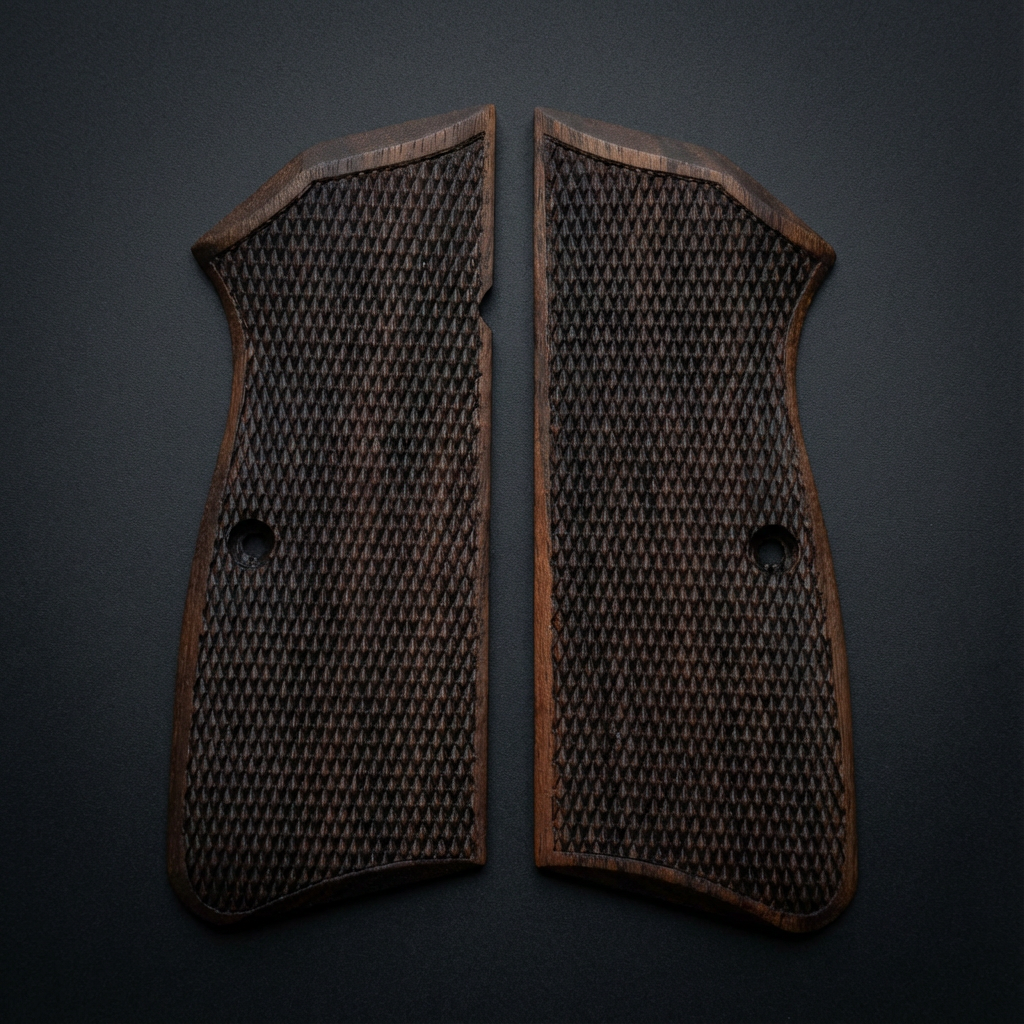 For a sleek, unified look, these Dark Walnut checkered grips are the ideal upgrade. The deep, rich tones of the wood blend seamlessly with black or blued steel frames. The full coverage checkering ensures that the pistol stays planted in your hand during rapid fire, offering both superior control and a timeless appearance.
