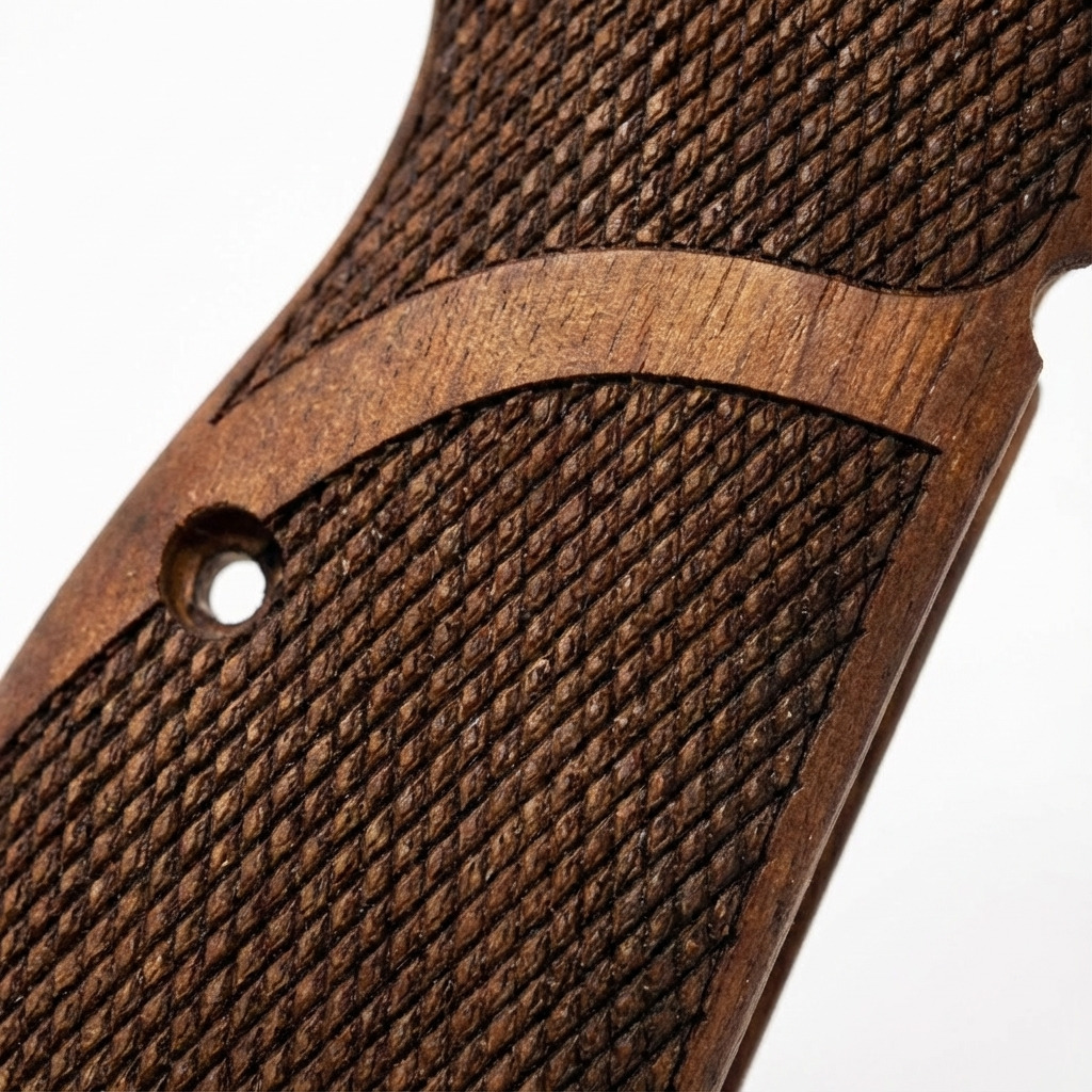 Carved from dense Premium Walnut, this model features a specialized cut at the top of the panel. It provides the necessary material to blend with the frame's beavertail (preventing hammer bite) while maintaining a sleek, "Half Tang" aesthetic that doesn't add unnecessary bulk. The surface texture ensures a solid lock-up for accurate shooting.