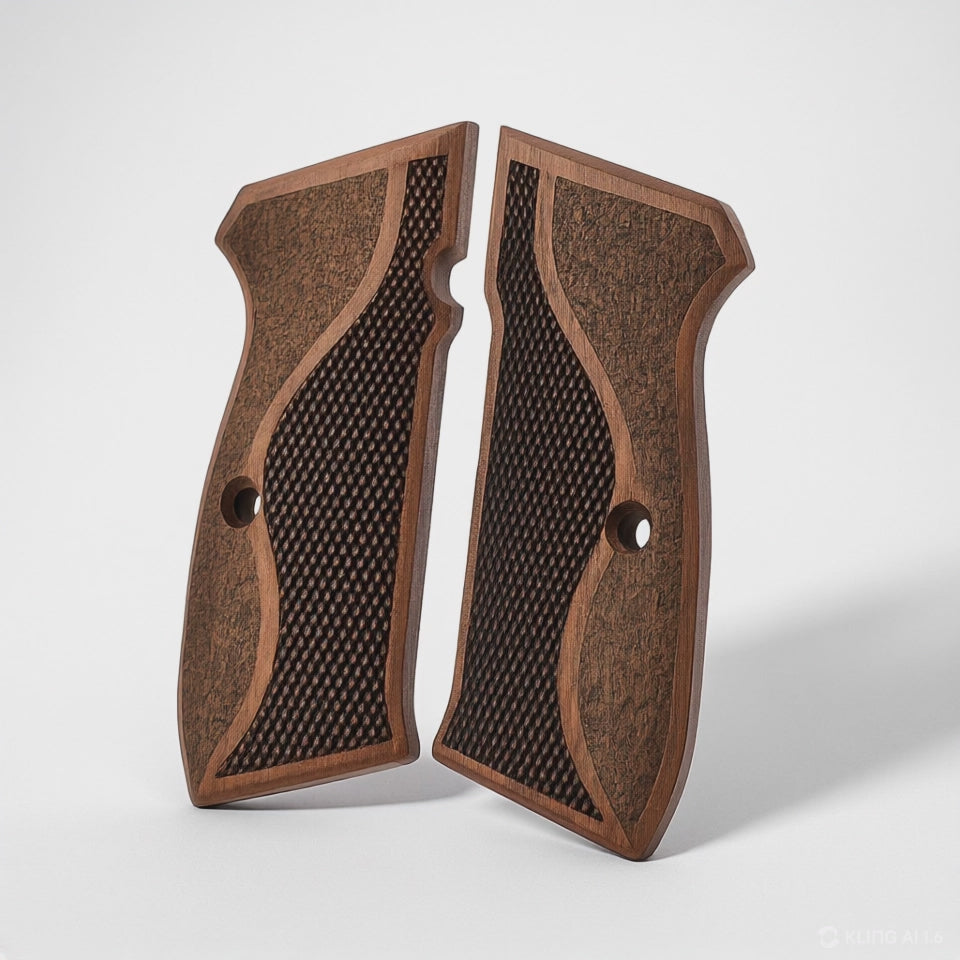 Handmade walnut CZ 75 B grips, diamond checkering, ergonomic wave contour, oil finish, rugged frontier aesthetic, U.S.–Canada market.