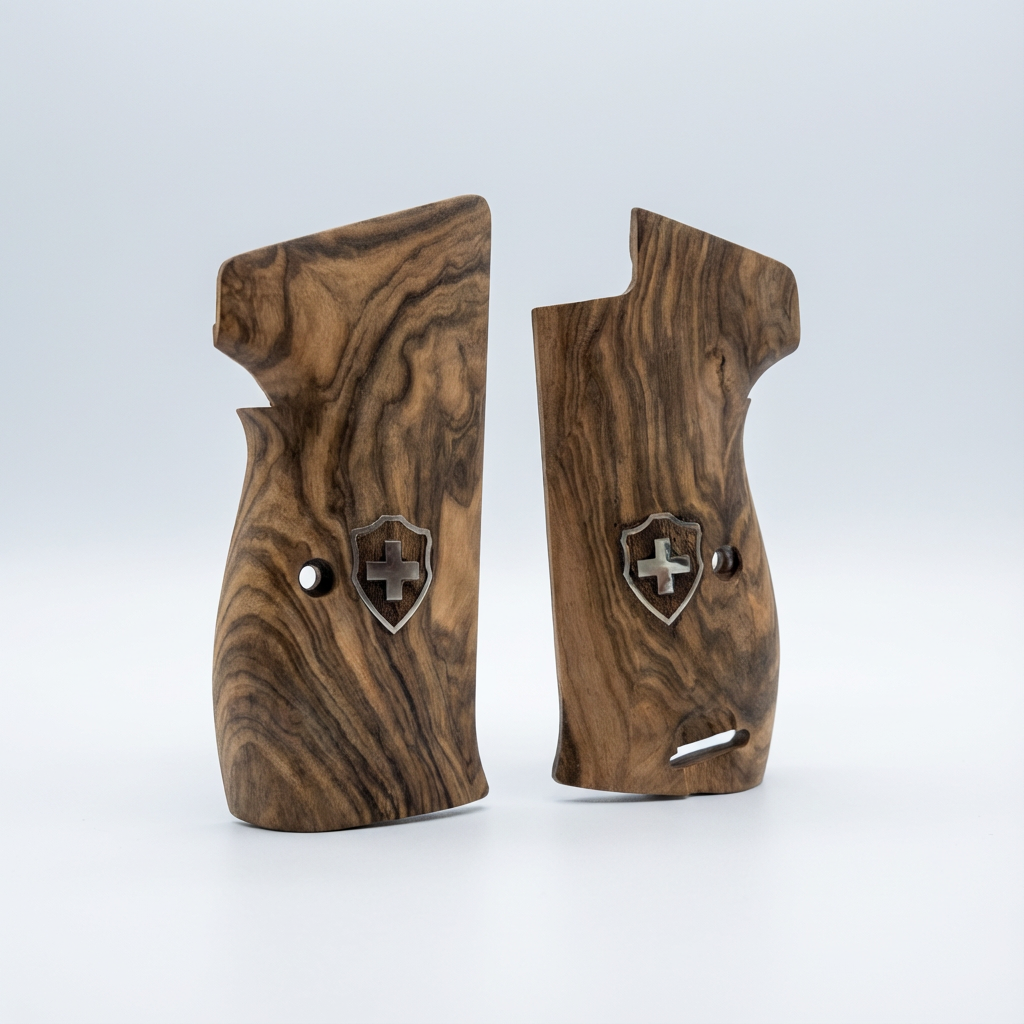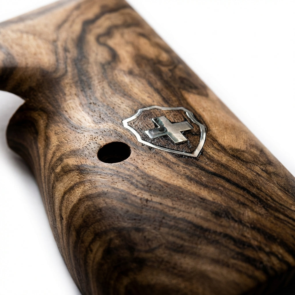 This is the pinnacle of our wood selection. The Exhibition Grade Walnut features high-contrast, mesmerizing grain patterns that turn your pistol into a display piece. Finished smooth to reveal every detail of the wood, and accented with a Silver Swiss Cross Inlay. A true collector's item.
