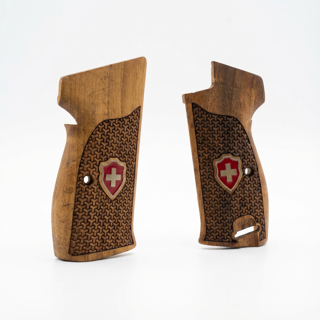 A perfect fusion of modern texture and classic identity. The Geometric Star pattern provides a unique, multi-directional grip feel that sets it apart from standard checkering. The inclusion of a Red Enamel Swiss Cross adds a touch of patriotism to this contemporary walnut grip.